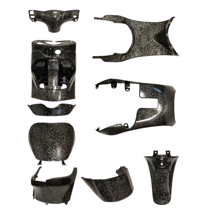 De forged carbon afwerking zorgt voor een strakke en moderne look. Past goed bij een SP-look ombouw of bij een scooter met andere forged carbon accenten.