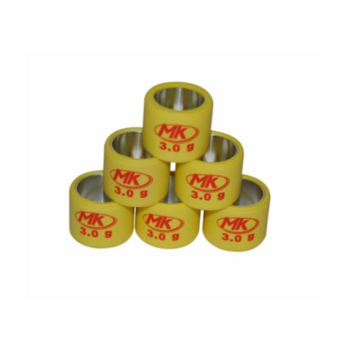 Wanneer de variateurrollen vlakke kanten hebben zijn deze aan vervanging toe (zie montage video) Na het verwijderen van de kickstartdeksel dient u de koelvin te verwijderen. Deze zit vast met de krukasmoer en kan verwijderd worden d.m.v. een luchtsleutel of variateur blokkeersleutel. Het gewicht van de variateurrollen is per scooter verschillend. Wanneer u niets veranderd aan de afstelling van de motor adviseren wij het huidige gewicht te behouden. Selecteer hieronder het gewichtSpecificaties