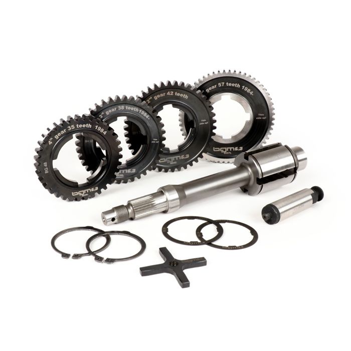 Versnellingsbak (tandwielen inclusief hoofdas) BGM PRO Vespa PX Lusso,Disc,My,2011 (1984->) PX125 (VNX2T 232053 >,ZAPM),PX150 (VLX1T 624602 >,ZAPM),PX200 (VSX1T 315267 >),Cosa,T5 125cc,LML Star 2-takt,Stella 2-takt 12/57,13/42,17/38,21/35 t