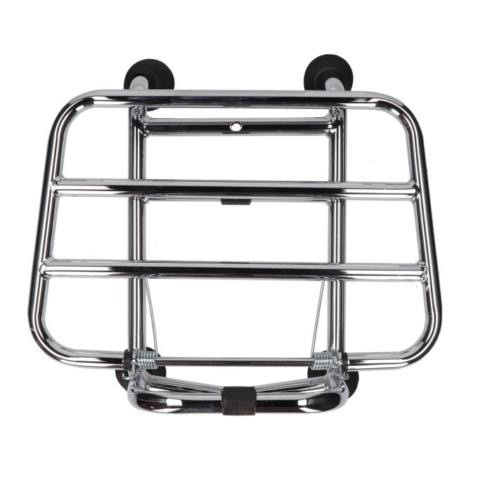 • Replica (Origineel model) • Kleur: chroom • Opklapbaar • Inclusief montage materiaal • Maximaal draaggewicht 15 kilogramMontage voordrager Vespa Primavera/Sprint chroom Supertec
